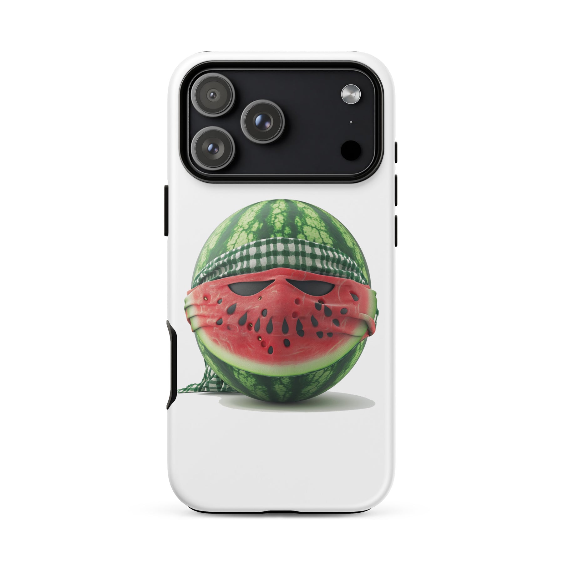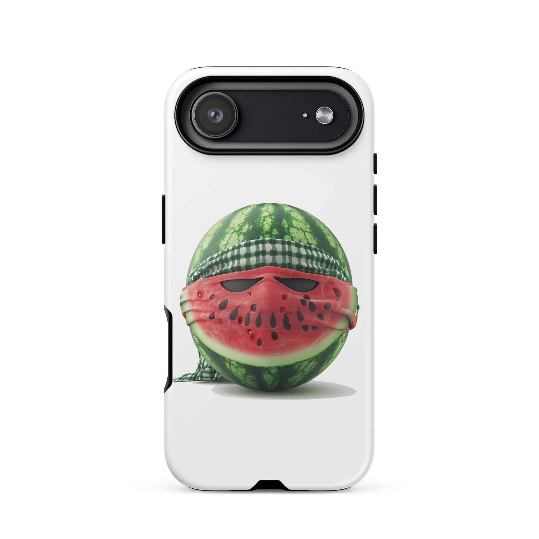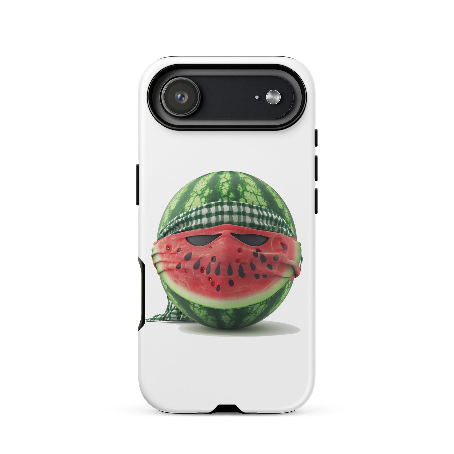This tough iPhone® case features the vibrant and defiant Watermelon Fighter design—an iconic symbol of Palestinian resistance, born from the colors of a banned flag. Built with a dual-layer shell for shock absorption and a smooth, scratch-resistant finish, it protects your phone while shouting truth without a word. Because even a fruit can fight back. Free Palestine.
