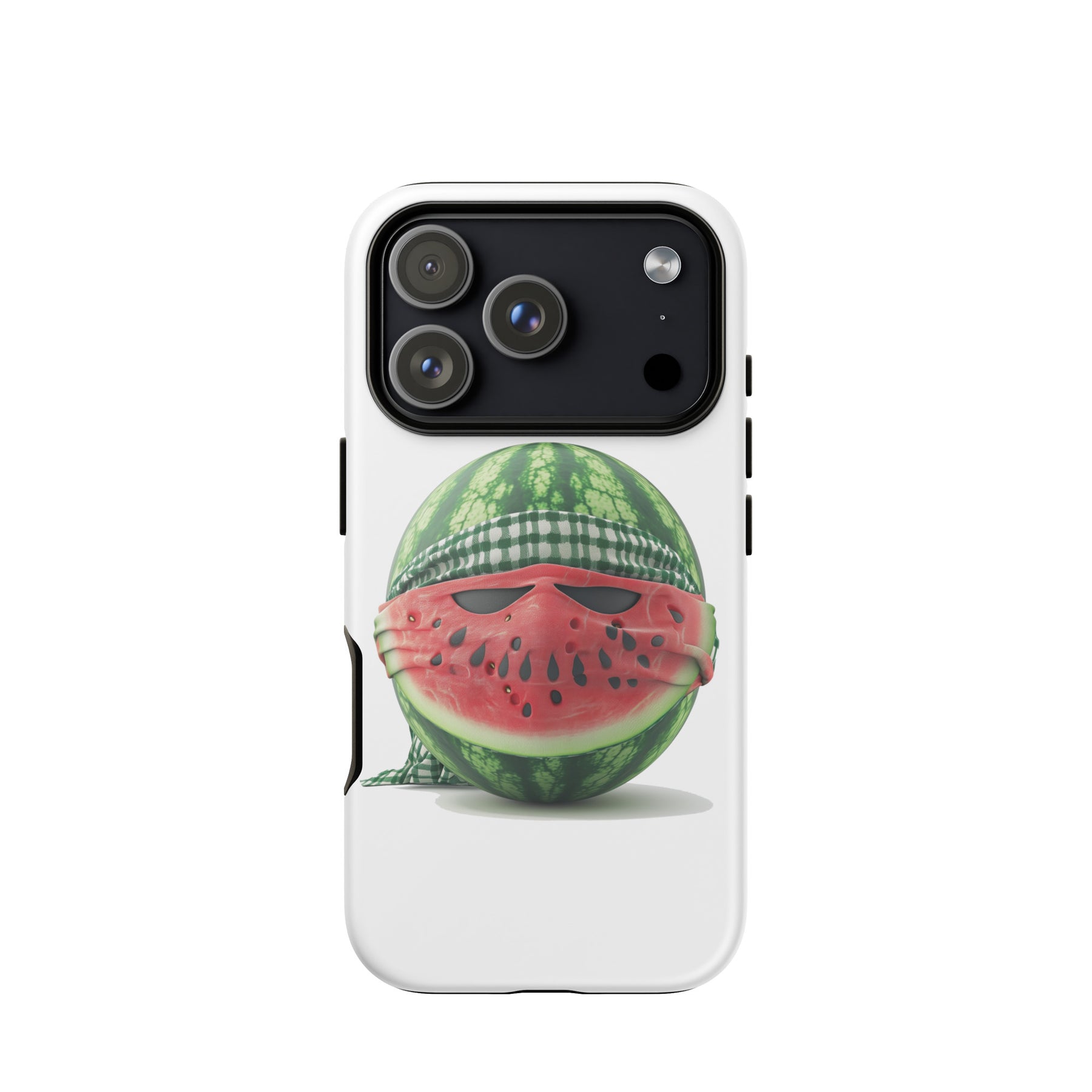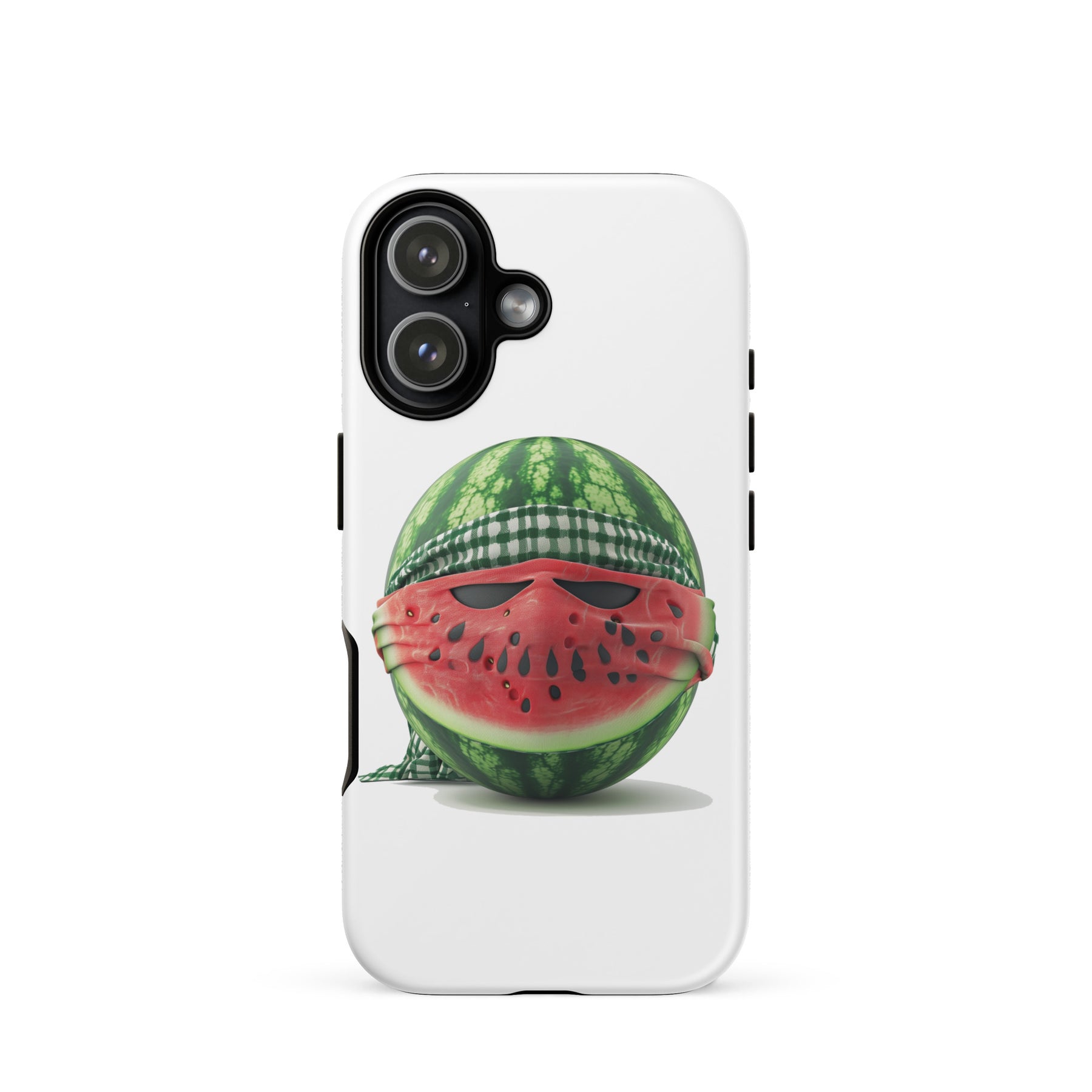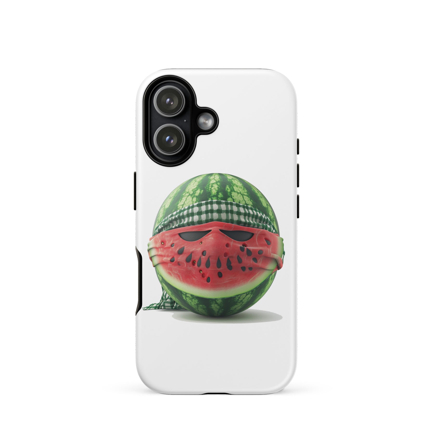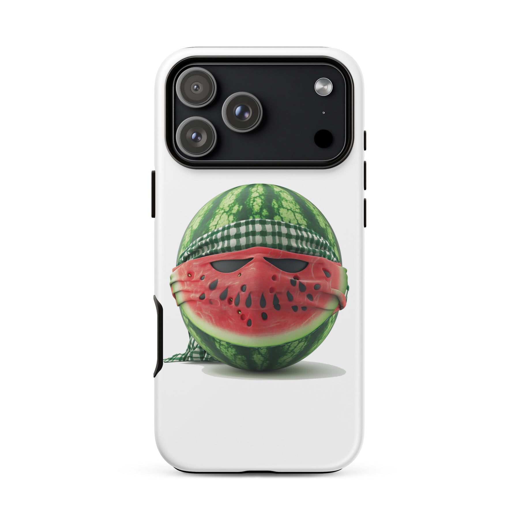 This tough iPhone® case features the vibrant and defiant Watermelon Fighter design—an iconic symbol of Palestinian resistance, born from the colors of a banned flag. Built with a dual-layer shell for shock absorption and a smooth, scratch-resistant finish, it protects your phone while shouting truth without a word. Because even a fruit can fight back. Free Palestine.