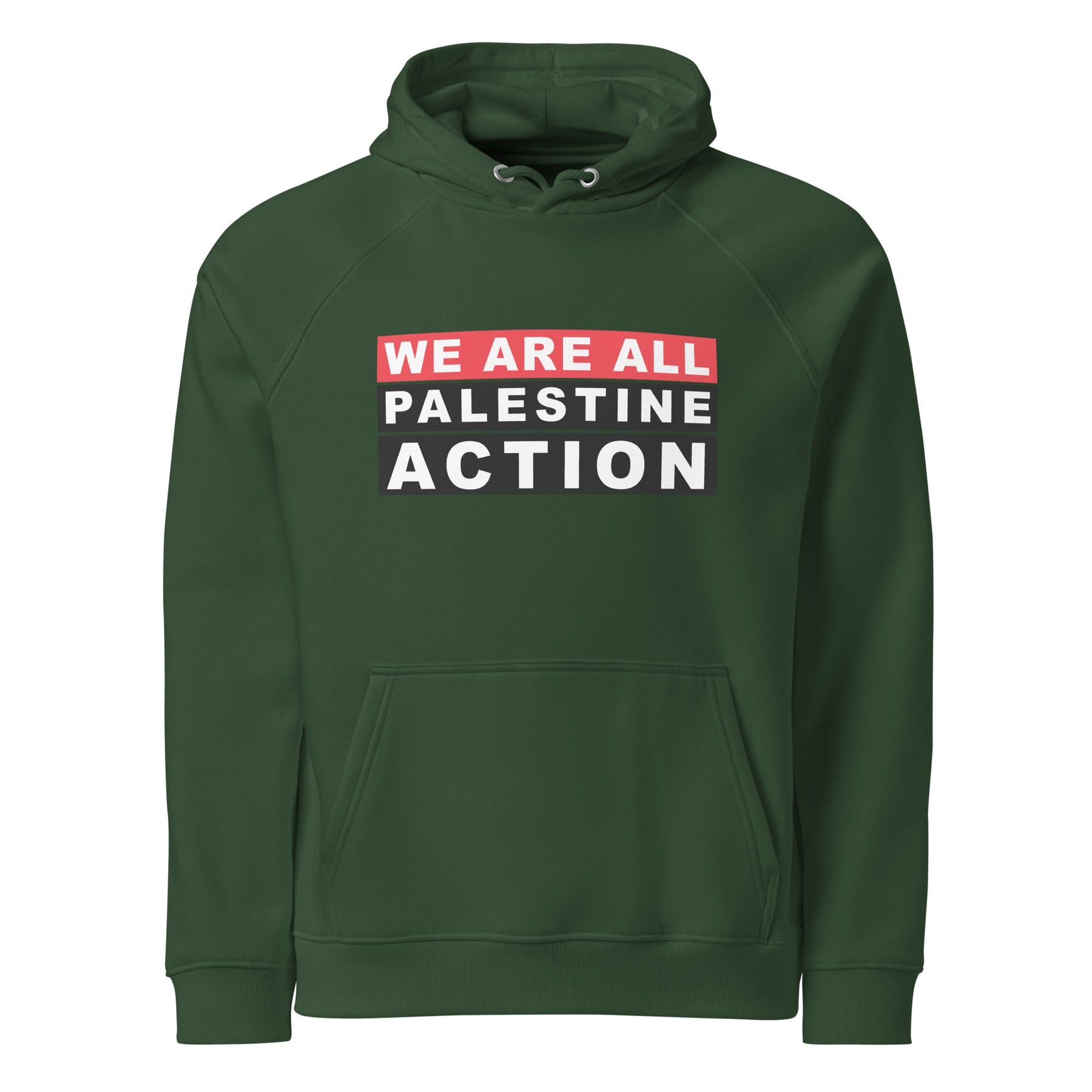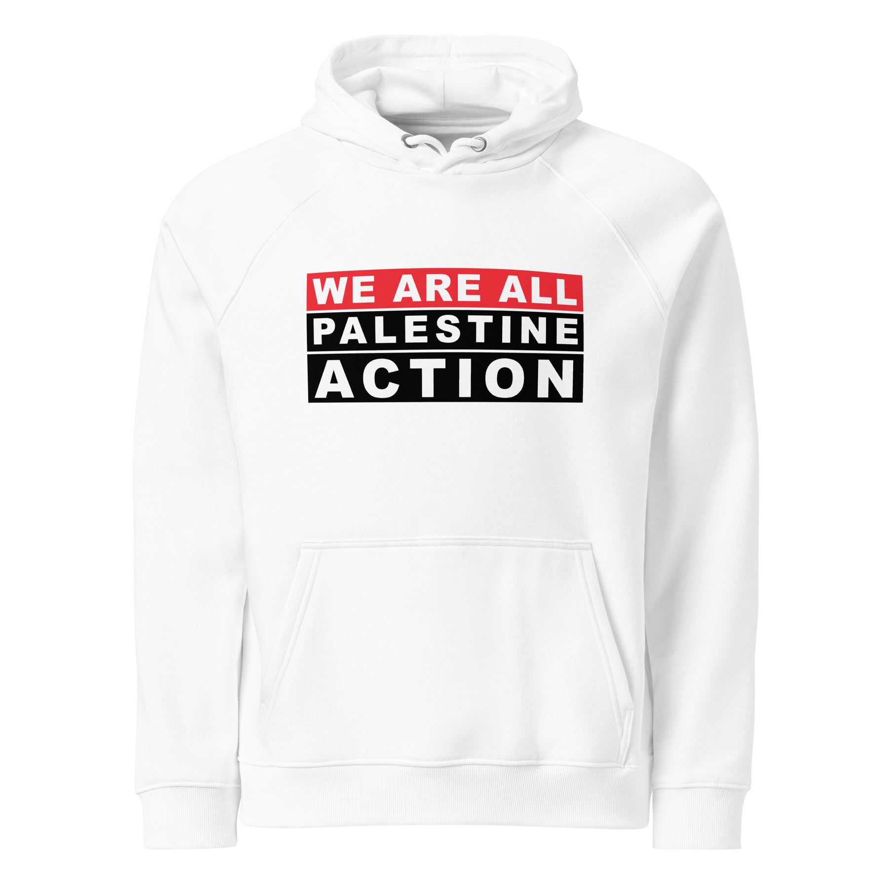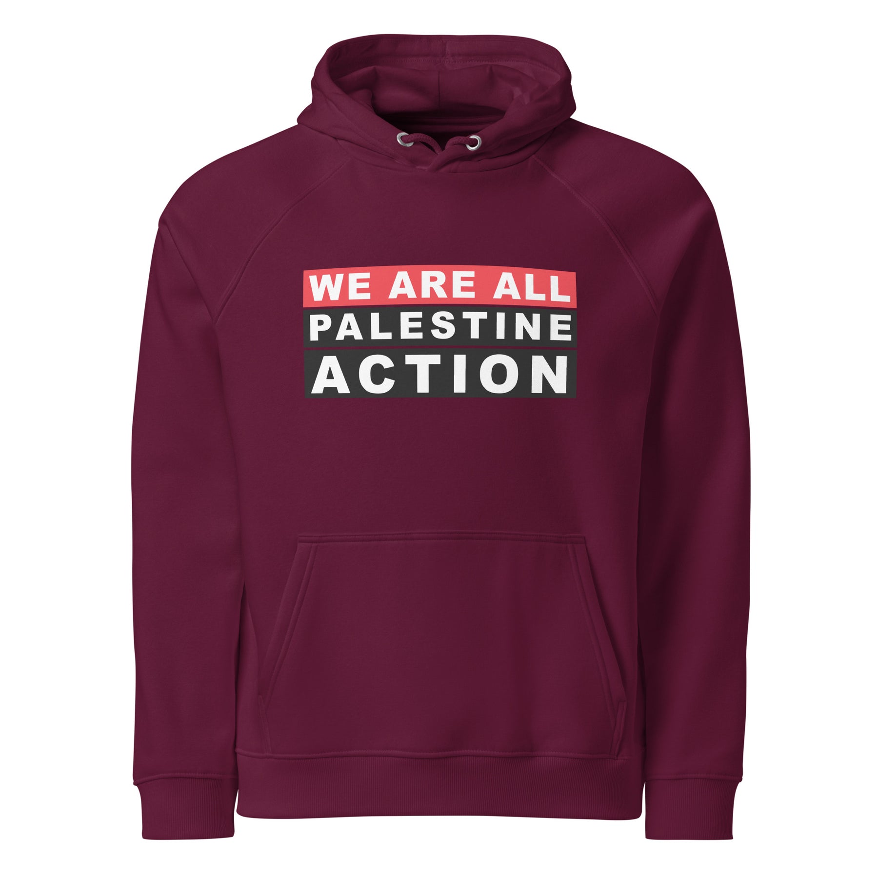 This organic cotton hoodie combines comfort, conscience, and commitment. Featuring the phrase “We Are All Palestine Action,” it’s a bold statement of solidarity with the people of Palestine, made for those who live their politics through purposefully chosen fashion.
